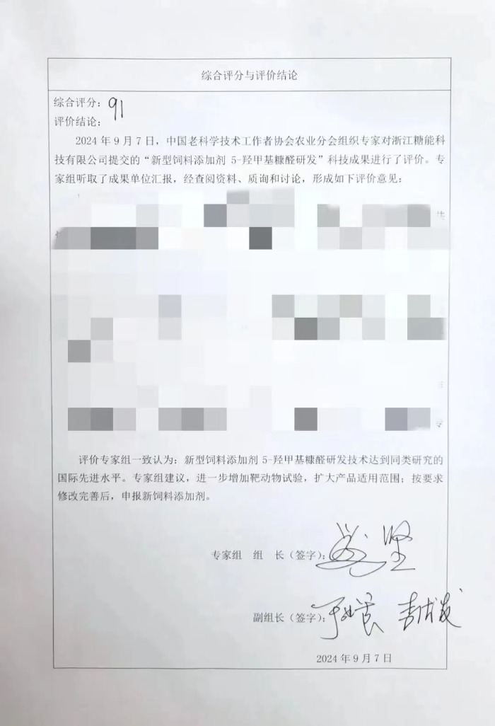 Dne 7. září 2024 prošly vědecké a technologické úspěchy „Výzkum a vývoj 5-hydroxymethylfurfuralu, nového krmného aditiva“ předložené společností Zhejiang Sugar Energy Technology Co., Ltd. odborným hodnocením organizovaným zemědělskou pobočkou Čínské asociace vedoucích vědců a techniků.
